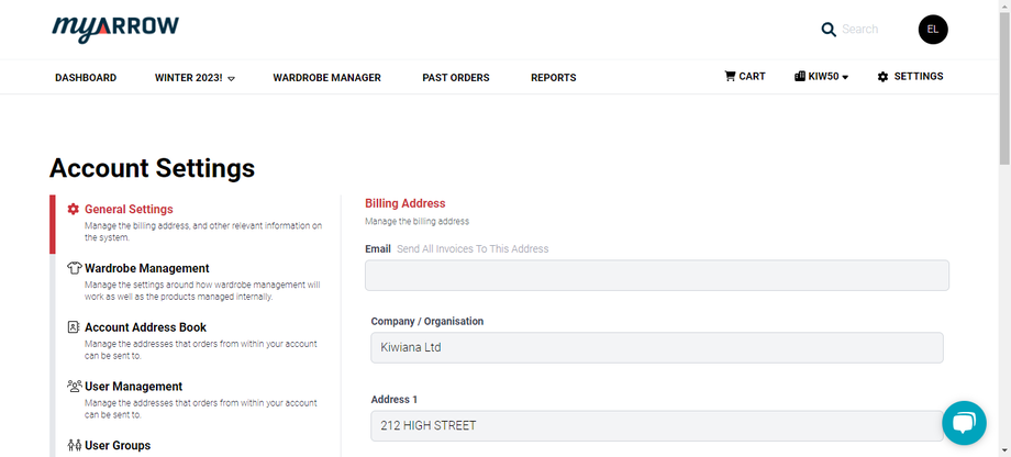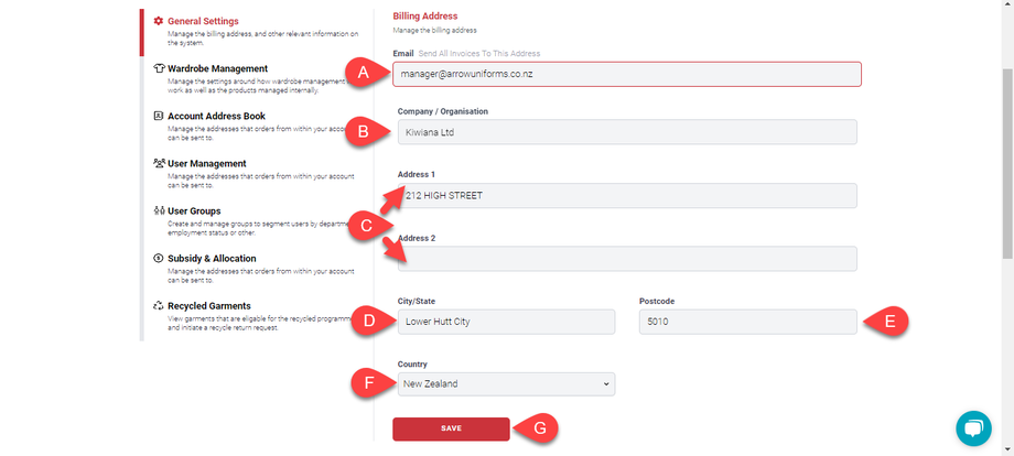 You will redirect to the Account Settings page, with various sections on the sidebar. This includes General Settings, Subsidy & Allocation, Recycled Garments, Wardrobe Management, Account Address Book, User Management and User Groups.
