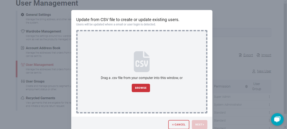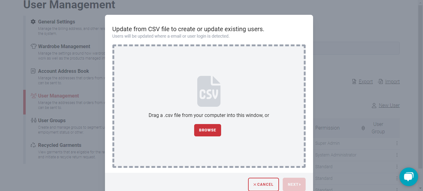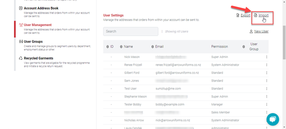 Click the “Import” button beside the “Export” button on the User Management Page.