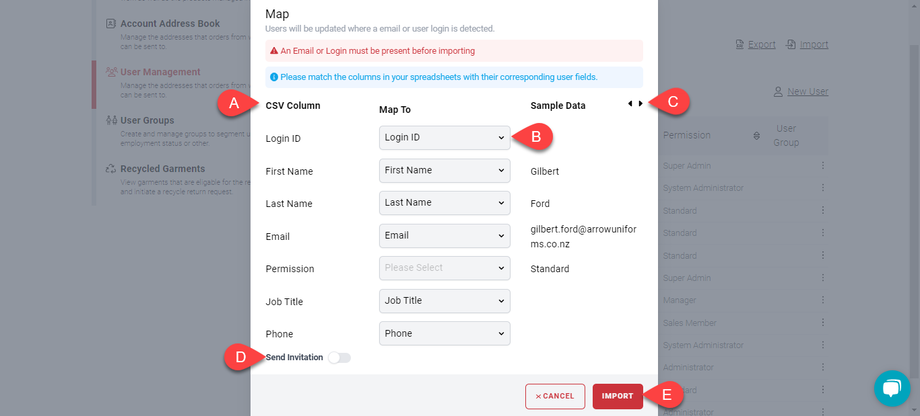 Notice that the (a) columns are automatically matched to fields. You can (b) click the dropdown button to map it to the correct field. The options include Login ID, First and Last Names, Email, Role, Job Title and Phone.
