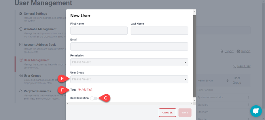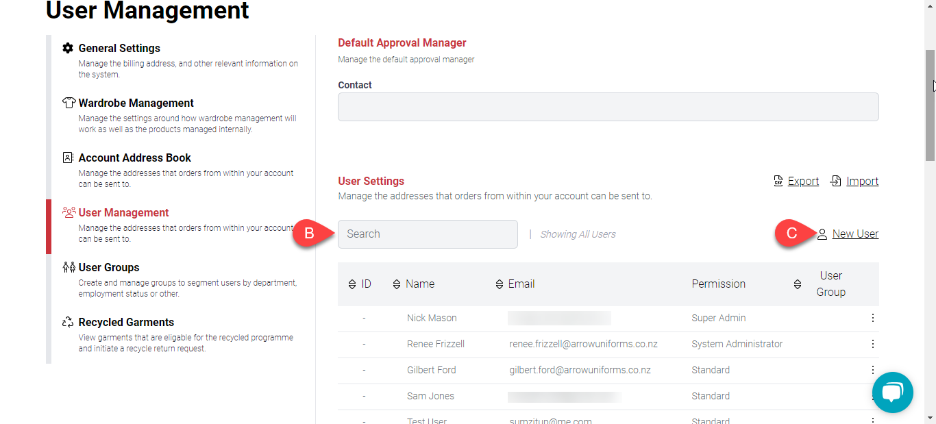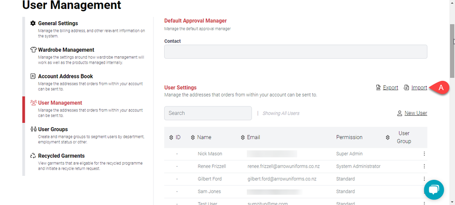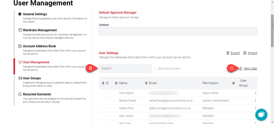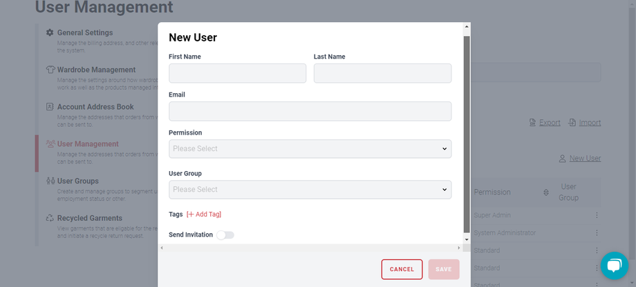 You will redirect to the Account Settings page, with various sections on the sidebar. This includes General Settings, Subsidy & Allocation, Recycled Garments, Wardrobe Management, Account Address Book, User Management and User Groups.