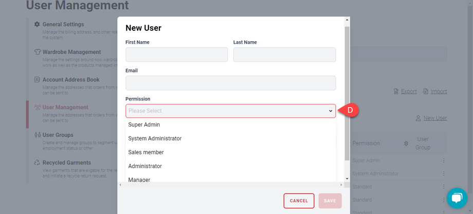 When you click (d) the dropdown button on the Permission, you can choose from the Administrator (Super Admin, System Admin), Manager, Sales Member and Standard options (See the summarised guide below for Roles and Permissions).