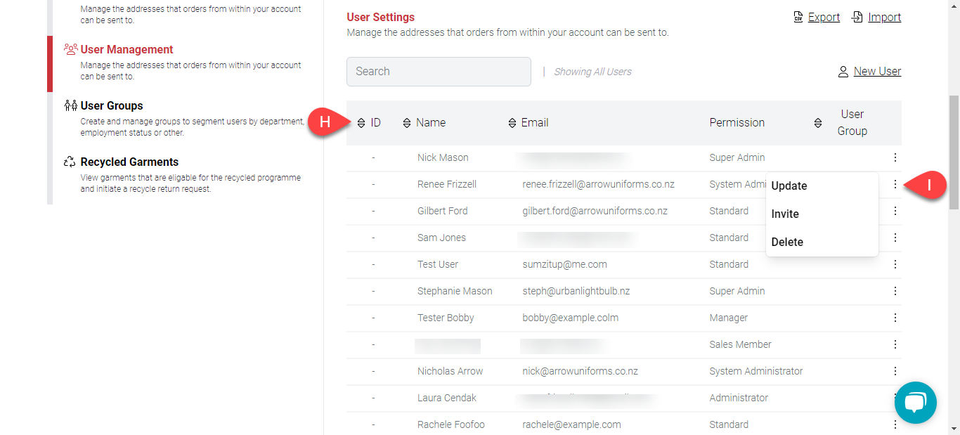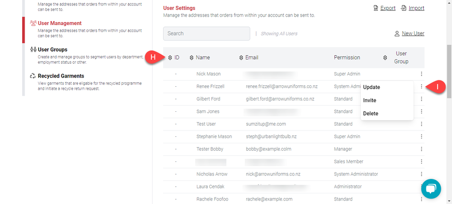 This should add the new user to the table/list. The (h) user list contains relevant information such as their ID, Name, Email, Permission and User Group.