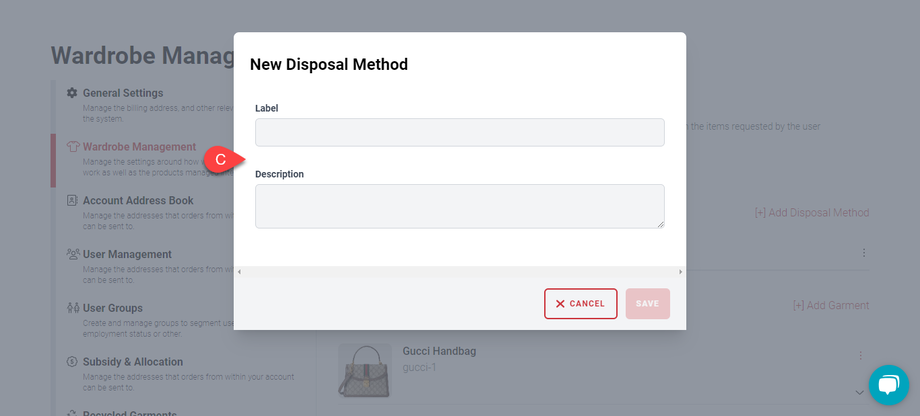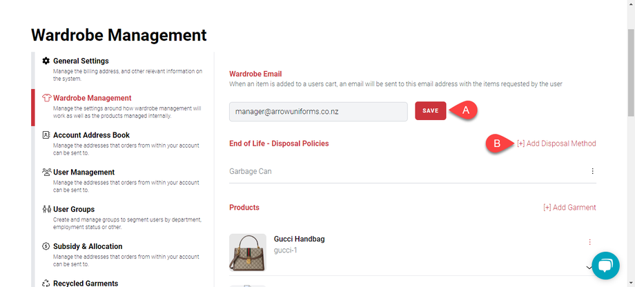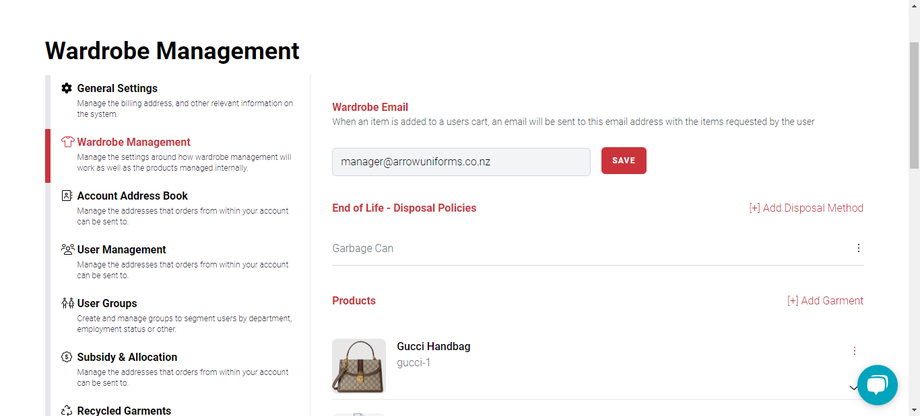 On the wardrobe management page, you’ll see three essential sections: Wardrobe Email, Disposal Policies and Products.