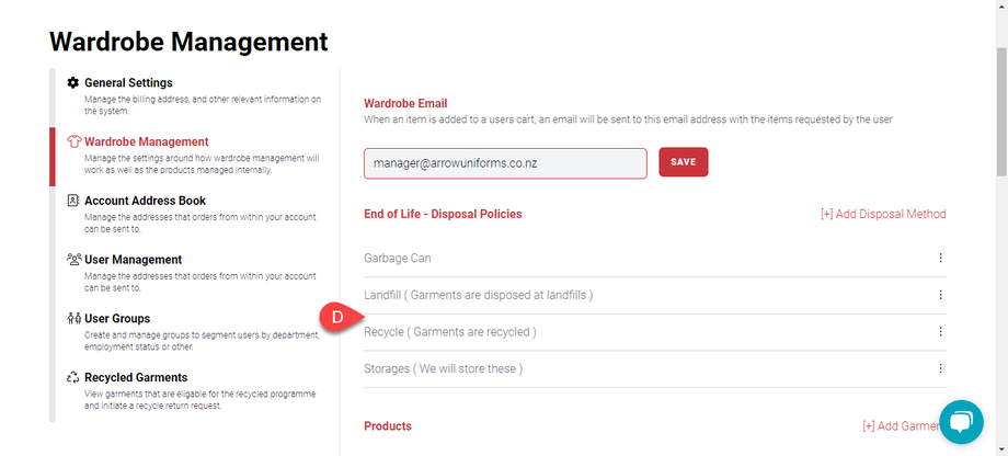 The Wardrobe Management Settings will allow certain features to be available to you, such as garment disposal policies and the products available to your account. These settings help you organise your myArrow account and the products or uniforms you use internally in the company, business, or school.