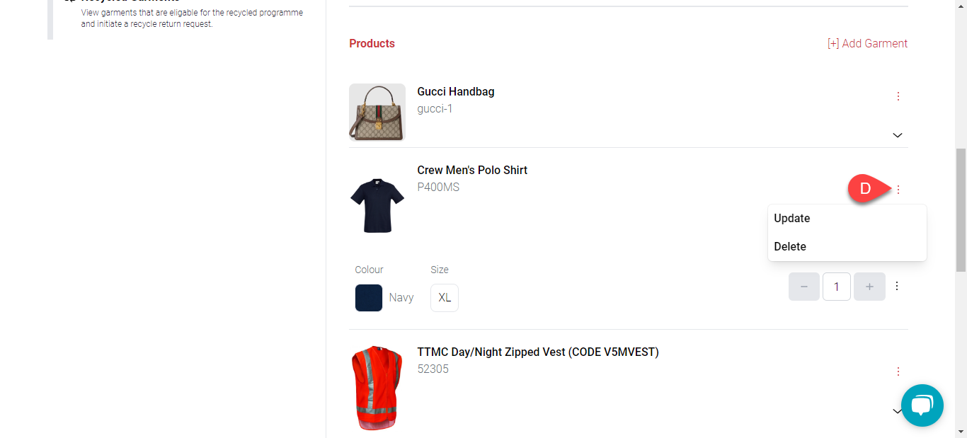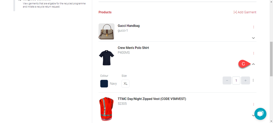The new garment should appear on the list. Click (c) the dropdown button to reveal the colour or size. You can also add in the quantity of the product your clients currently have for disposal by clicking the “+” or “-” buttons.