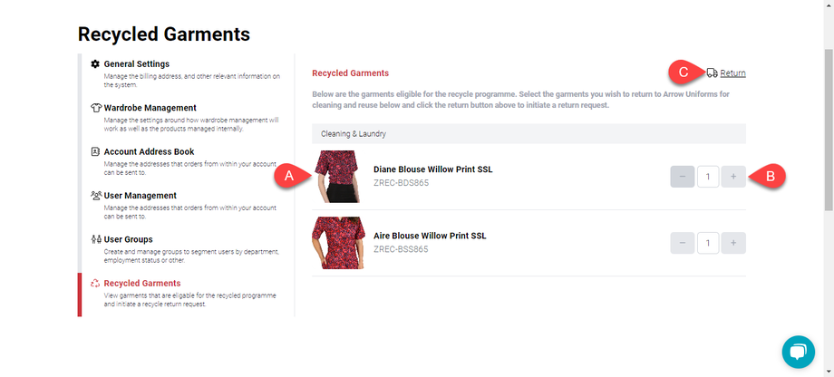 The Recycled Garments Tab will (a) show the list of the garments that are part of the recycling programme. Click (b) the quantity buttons to add the number of garments you wish to return for cleaning and reuse. Lastly, (c) click the return icon on the upper right side of the tab.