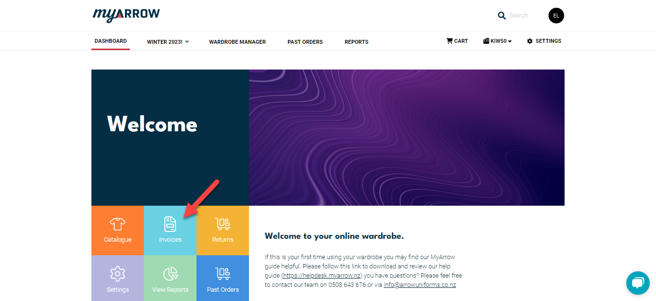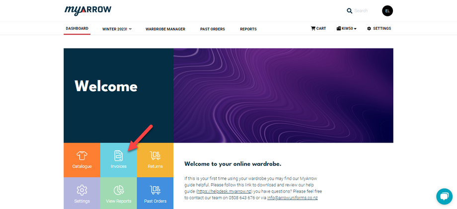 Login to your myArrow account (see Login tutorial), and you will navigate to your company’s dashboard. On the dashboard, look for the Invoices icon and click on it. This will bring you to the Invoice History Page.