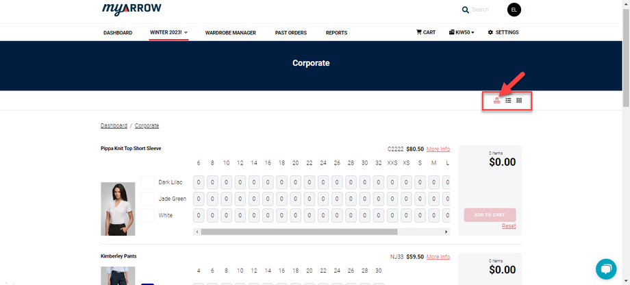 This display setting shows a smaller thumbnail for the products with dropdown buttons for size and colour and a text field for the name badge when appropriate. You can also add the products to your Cart on the right side of the product listings.