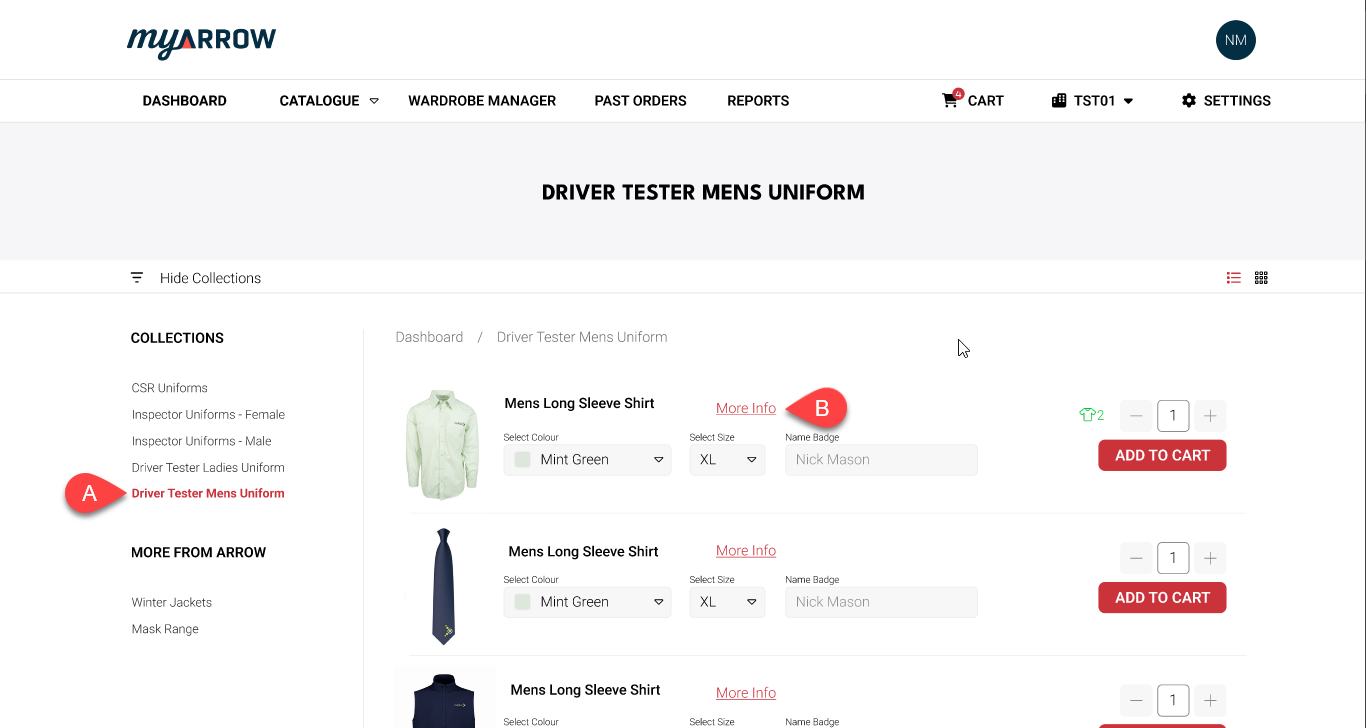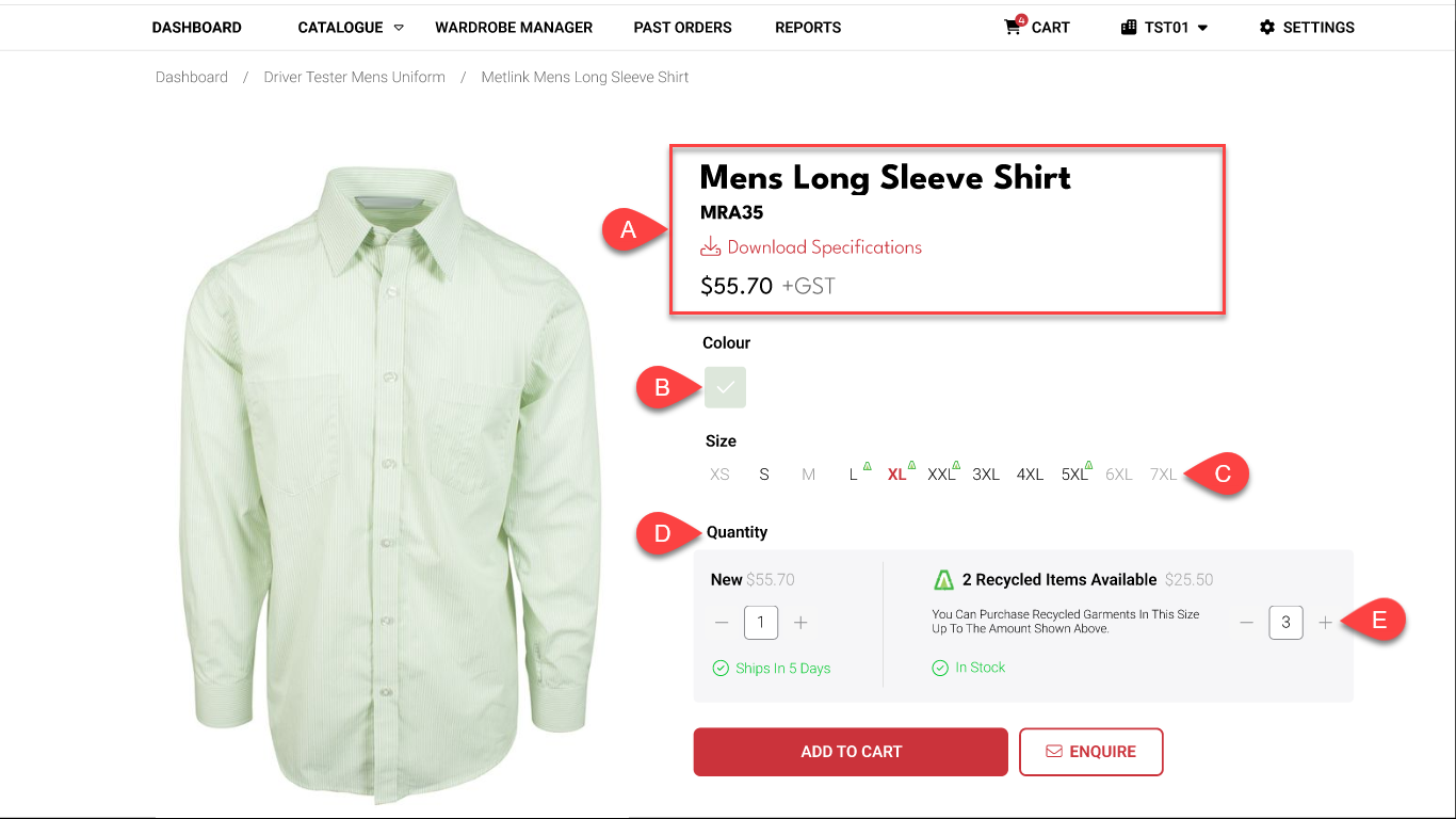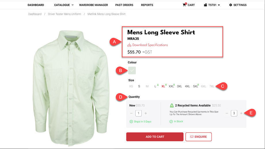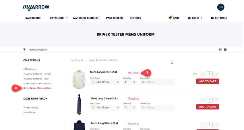 When browsing through the collections and finding what you need, click on a specific product to go to the Product Page. In the example above, (a) we're browsing through the Driver Tester Men's Uniform, wherein the text is highlighted in red in the catalogue sidebar.