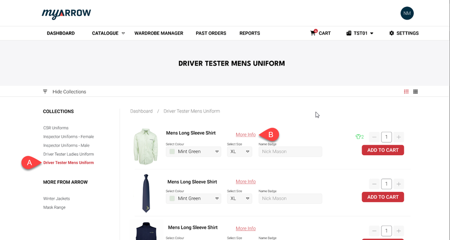 The catalogue display shows all the products and accessories included in the Driver Tester Men's Uniform Collection. Click the thumbnail or image of the product you wish to view more information from or thinking of purchasing (b). We're clicking on the Men's Long Sleeve Shirt for this example.